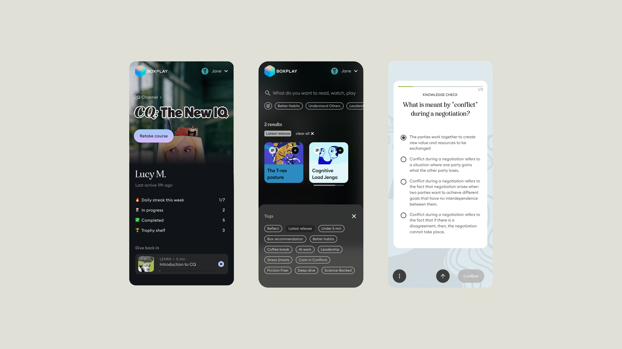 Lead designer on the launch of BoxPlay’s new b2b learning platform and public site, built around Communication Quotient a core learning series focused on active listening, critical thinking and negotiation.
